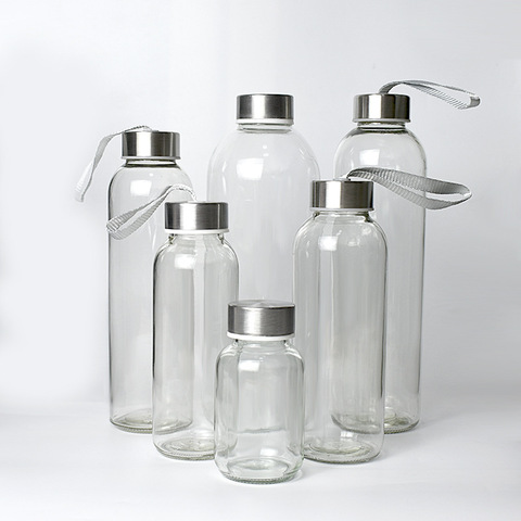 Cheap 500ml 1000ml Glass Sports Water Bottle With Metal Lid and Strap Portable Travel Mug